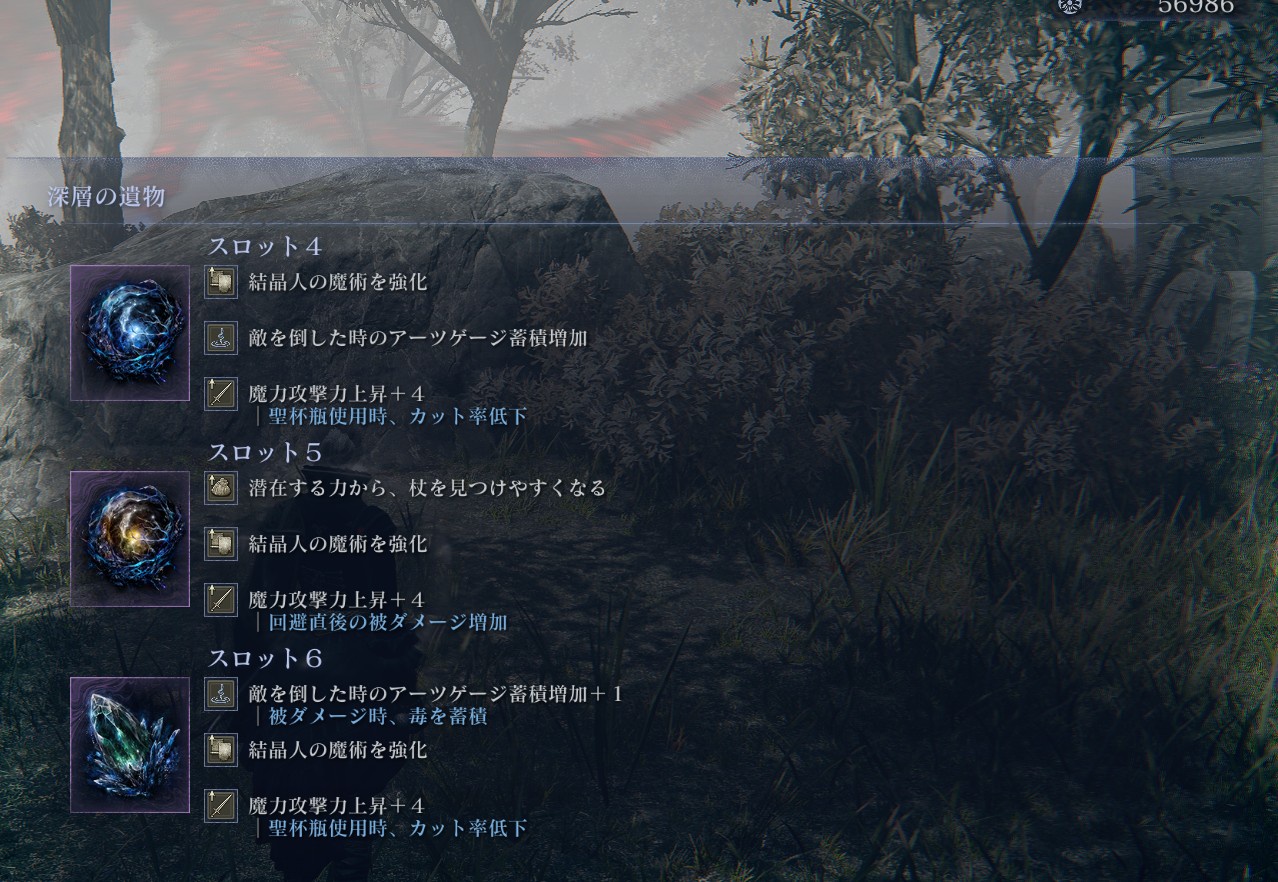 毒状態の敵+2(最大未満時攻撃力低下)、結晶人、魔力+3(被ダメ腐敗)